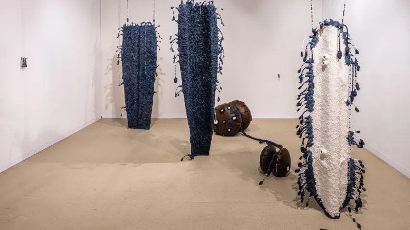 cameron clayborn’s sculptures in the series homegrown hang suspended from the ceiling like cocoons. By appearing to be standing on tiptoe, they command distance, and yet their materiality lures viewers into taking a closer look. Thus seesawing between distance and closeness, solidity and fragility, clayborn informs the work with great vitaliy and an impressive physical presence.