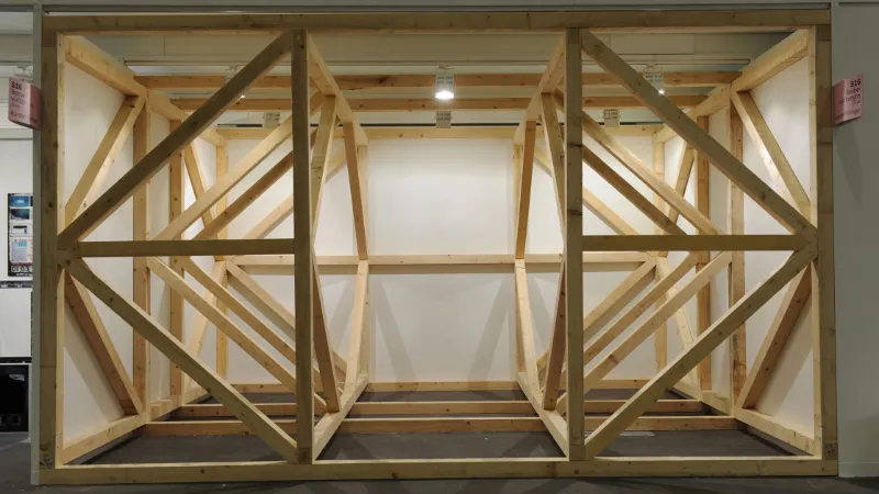 Karsten Födinger is a sculptor whose site-specific works make no attempt to conceal the character of the buildings and their imperfections. Often constructed out of simple building materials, his works are visual embodiments of physical forces. A cross between architecture and sculpture, they are informed with the tension between stasis and movement, diagonal and horizontal, mass and void. The piece on view at Art Statements makes reference to a historic event in Basel: the cataclysmic earthquake of 1356. Födinger‘s sculptural intervention of horizontal and vertical wooden beams both stabilizes and obstructs the interior of the art fair stand, creating a paradoxical spatial configuration.