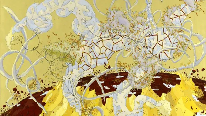 Matthew Ritchie creates work that is a cross between drawing, installation, and painting; it is a manifestation of the artist’s personal cosmology. In additive, collage-like compositions that cover canvases but may also spill over onto walls and ceilings, the handwritten act of painting is linked with virtual planes that seem to be computer-generated. Symbolism drawn from both private and public (computer) worlds yields a complex, inextricably interwoven vision in which the beholder can “surf” at will.