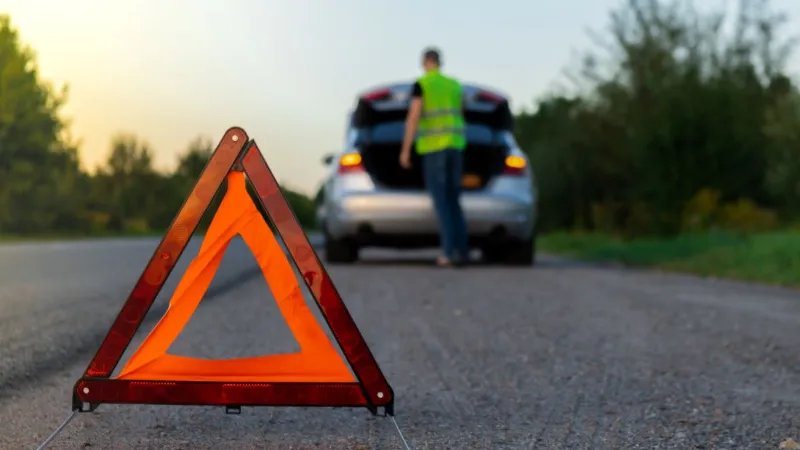 - Ein Warndreieck und reflektierende Westen, die bei einer Panne oder einem Unfall obligatorisch sind. Idealerweise sollte sich eine der Westen vorne bei Ihnen befinden.