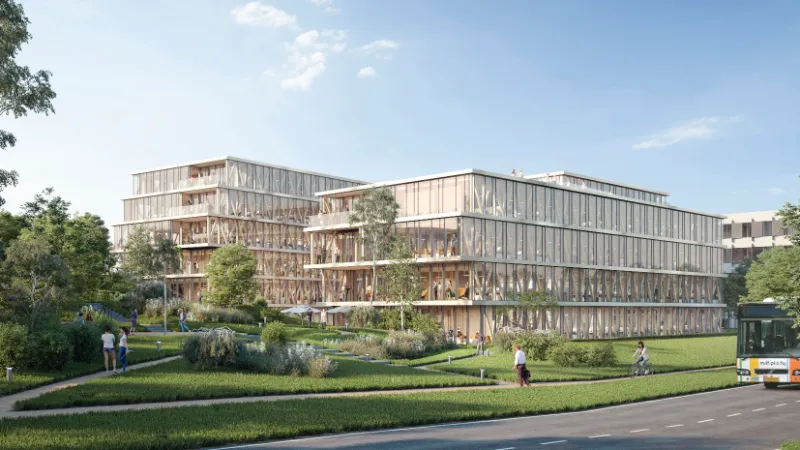 Derrière ses façades vitrées sur six niveaux, le nouveau bâtiment Wooden révèle une ossature en bois, dont les lignes en V lui confèrent un caractère unique. Exemplaire en matière de développement durable et de bien-être, l’immeuble de 9.600 m2 offrira à ses occupants un environnement de travail d’une qualité inédite.