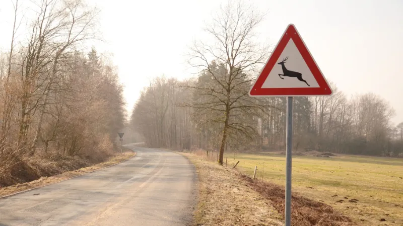 - Fahren Sie vor allem in den Morgen- und Abendstunden sowie nachts in ländlichen (Wald‑)Gebieten, an hohen Mais- und Getreidefeldern und insbesondere in Wildwechselzonen langsamer. Dadurch haben Sie mehr Zeit, auf Wildtiere zu reagieren.