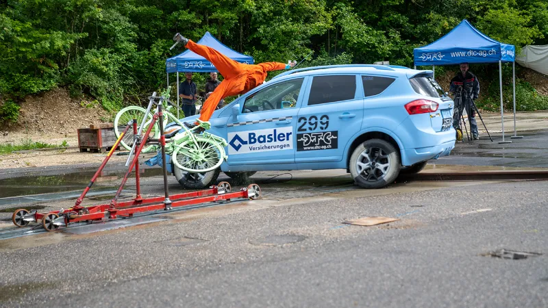 Premier crash test: une collision entre une voiture et un vélo électrique au débouché d’une route. La voiture et l’e-bike se rapprochent l’un de l’autre selon un angle aigu. L’automobiliste ne voit pas le cycliste ou le voit très mal. L’analyse effectuée après coup par Rolf Thommen, responsable de la police de la route de Bâle-Ville, montre qu’étant donné la situation, à savoir une visibilité très réduite, il était très difficile pour l’automobiliste de prendre toutes les précautions d’usage à l’égard du cycliste, qu’il aperçoit trop tard et dont il sous-estime sans doute la vitesse.