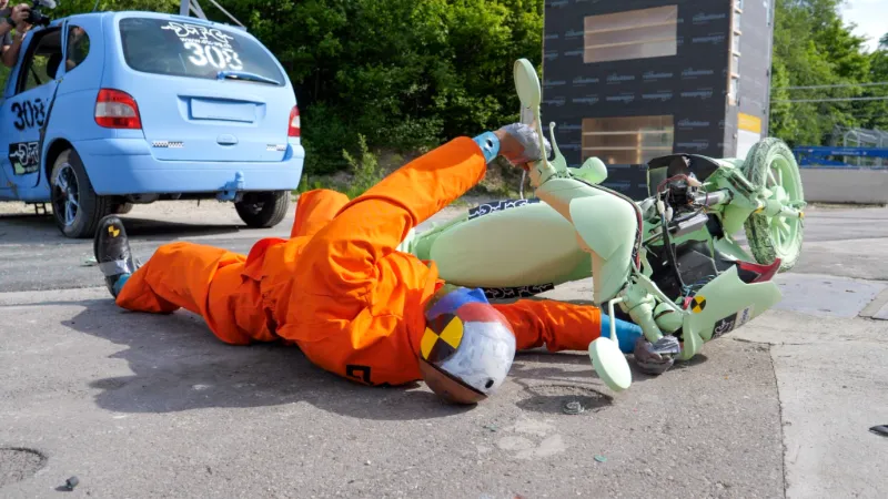 Le premier test reprend le scénario d’un scooter électrique ayant percuté le flanc d’une voiture dont le conducteur, ignorant que le scooter est trafiqué, a sous-estimé sa vitesse. Rolf Thommen, chef de la police de la circulation de Bâle-Ville, analyse ainsi les faits : « L’automobiliste semble avoir été surpris par la vitesse excessive du scooter électrique. En général, le pilote de celui-ci heurte d’abord la voiture de la tête puis du corps tout entier et subit lors du choc et de la chute qui s’ensuivent de graves blessures. À une telle vitesse, un casque aurait offert une protection indispensable. »