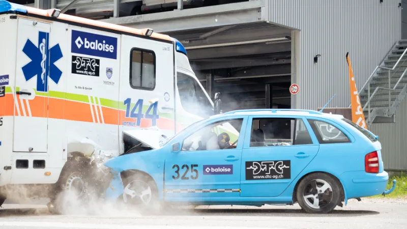 Un nouvel accident se produit maintenant: une voiture particulière (un parent et un petit enfant se trouvent dans le véhicule) percute l’ambulance par le côté. L’enfant est heureusement bien sécurisé dans un siège pour enfants équipé d’airbags et est ainsi encore mieux protégé des conséquences de l’accident. L’ambulance est fortement accélérée latéralement par le choc, le secouriste, debout, non sécurisé, ne peut plus se tenir à l’intérieur du véhicule, se trouve projeté dans l’ambulance et sa tête heurte celle du patient. Le médecin, assis dans le sens inverse de la marche, sécurisé et correctement attaché, reste certes attaché à son siège pendant la collision, mais il heurte la paroi intérieure du véhicule. Fabian Aschwanden, responsable du département Sécurité passive de la DTC Dynamic Test Center AG, ajoute : «La sécurisation correcte des passagers est également très importante dans une ambulance. Il faut sinon s’attendre à de graves blessures résultant de chocs avec l’équipement intérieur du véhicule ou avec d’autres passagers.»
